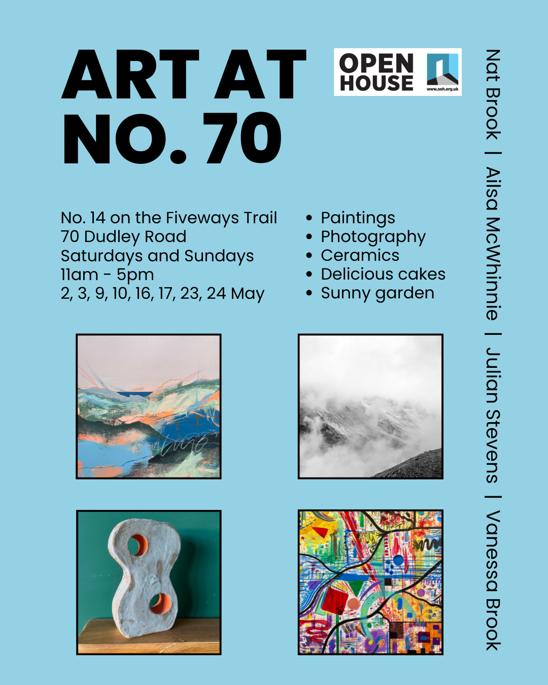 Also exhibiting in the house will be photographer Ailsa McWhinnie, abstract artist Julian Stevens and ceramicist Vanessa Brook.